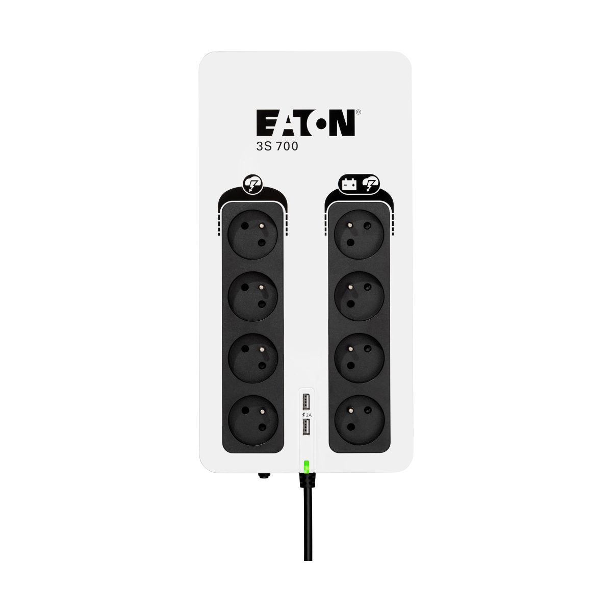 UPS Eaton 3S gén. 2 FR, 700 VA, 420 W, entrée : française, sorties : (4) françaises, (4) françaises – ondes de choc uniquement, communication USB, chargement USB (2), tour